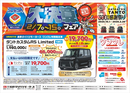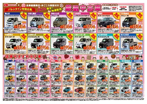 2月6日(金)信濃毎日新聞の折込チラシをご覧いただけます。 タントカスタムのワンクレ特別限定車情報や、バレンタイン特別企画の中古車抽選販売についても詳しく載っています❣