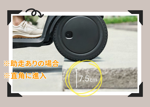 大径タイヤのため、最大7.5㎝の段差も簡単に乗り越えられます!