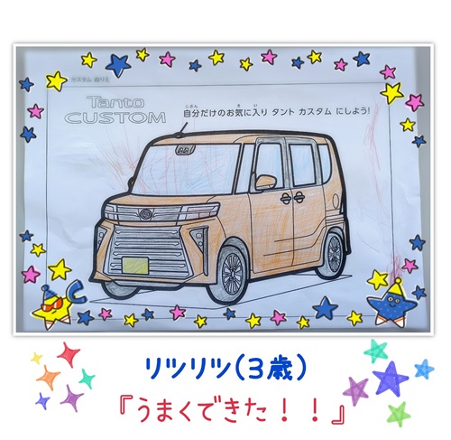 お父さま、お母さまがそれぞれお乗りいただいているトールカスタムとタントカスタムをカラフルに丁寧にぬってくれました。