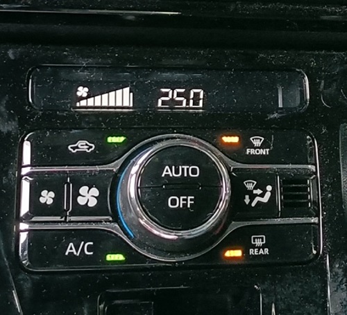 写真のようにオートエアコン25℃設定でフロントデフロスターとリアデフォッガーがONになっています!
