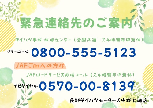 誠に恐れ入りますが、上記期間中にお車の事故・故障等で緊急の場合は