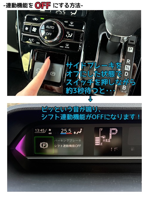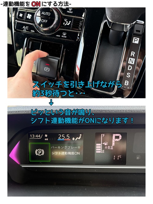 メーターに「パーキングブレーキシフト連動ON」という表示がでます。