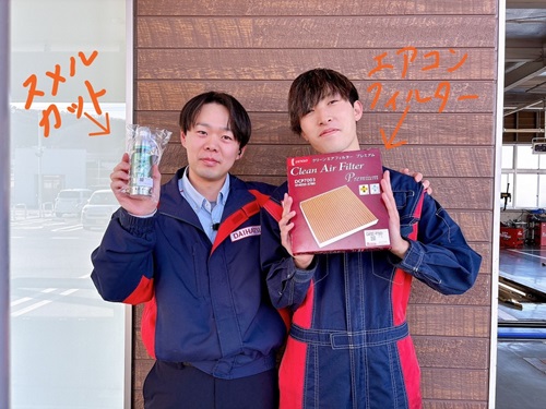 春 春の花粉シーズン到来!車内でもできる花粉対策5選🚗 皆さん、近頃は花粉や黄砂が多く飛ぶ季節になってきましたね😷 実は、車内でも花粉対策ができるんです! ① 内気循環を使う 花粉が多い日は、エアコンを内気循環に切り替えるのがおすすめです。 ② 乗る前に服や髪の花粉を払う 車に乗る前に、服や髪についた花粉を軽く払うだけでも車内への持ち込みを減らせます。 ③ 車内をこまめに掃除する シートやマット、ダッシュボードに花粉は溜まりやすいです。 ④ 窓を長時間開けない 花粉が多い日は、走行中に窓を開けっぱなしにしないようにしましょう。 ⑤ エアコンフィルターを定期交換(重要!) 車内の花粉対策で一番大切なのは、エアコンフィルターの交換です。 汚れたままだと、空気がこもったり、嫌なニオイの原因になることも。 さらに、エアコンの嫌なニオイが気になる方には、スーパースメルカットの使用もおすすめです。