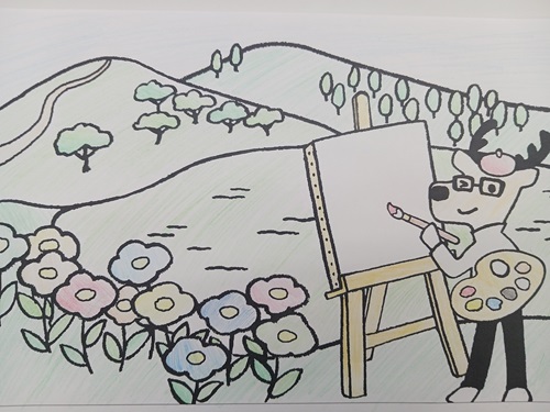カラフルなお花と木、カクシカ君可愛いね、カクシカ君がこれからどんな絵を描くのか楽しみだね